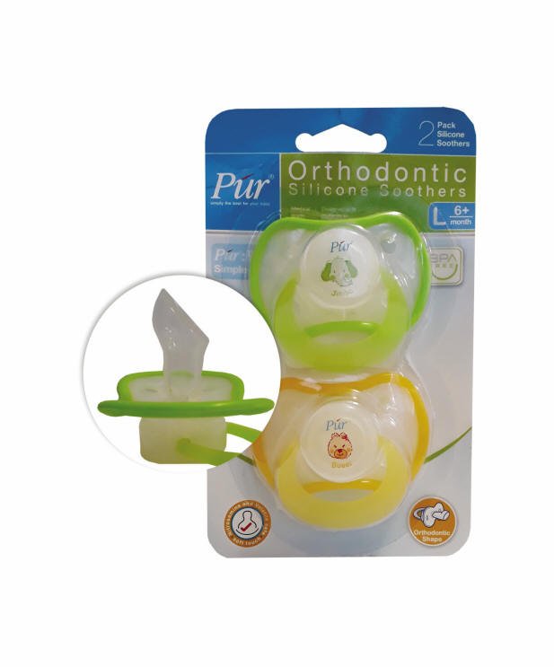 PUR® Orthodontic Soother 6+ months is designed to fit perfectly in your baby’s mouth and help form your baby’s palate by improving suction.